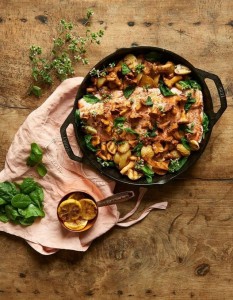 Faites revenir les pommes de terre dans la même poêle 5 à 7 mn, puis disposez-les autour du saumon. Poêlez les girolles et les gousses d’ail coupées en deux durant 3 mn, puis placez-les sur les pommes de terre.